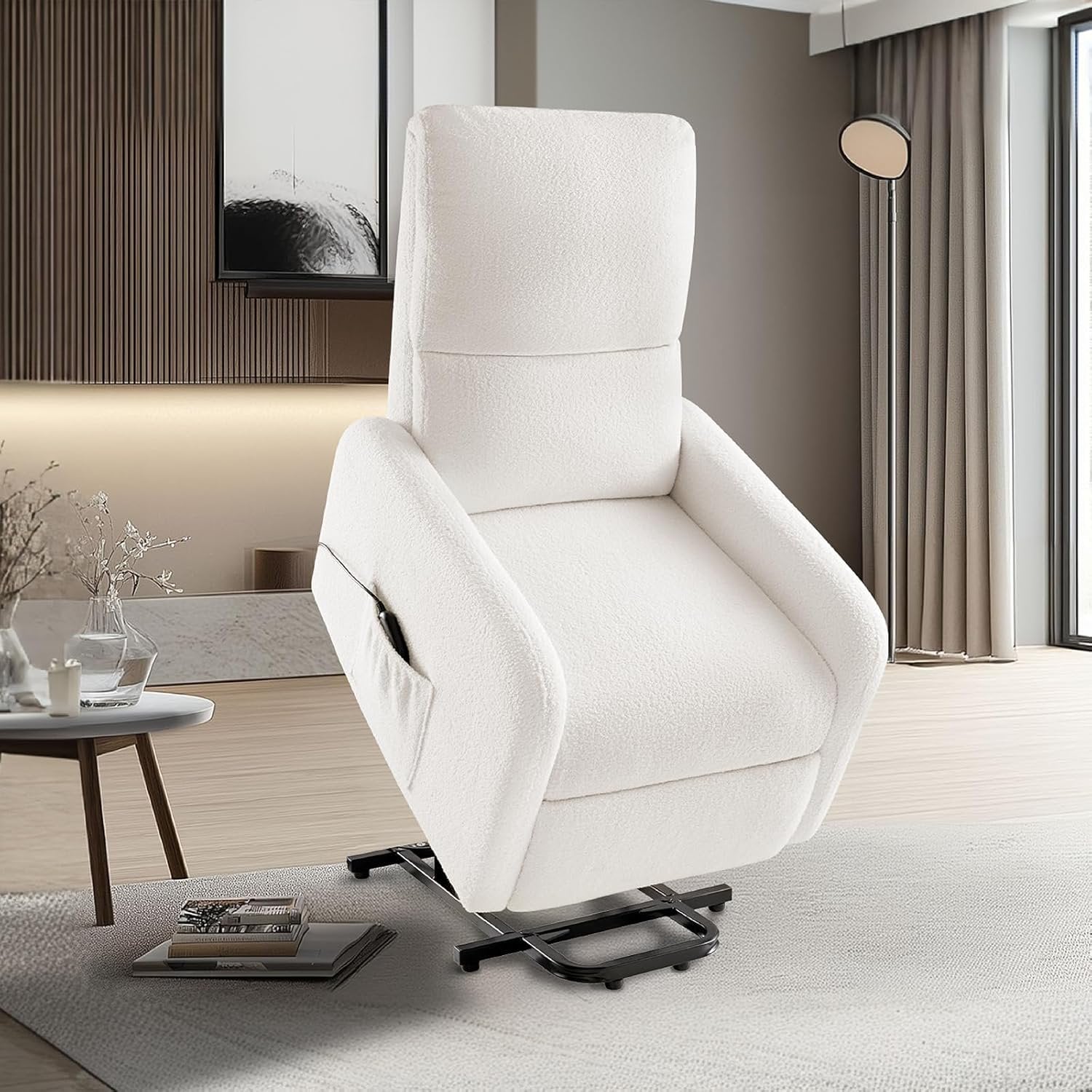 The high-quality metal lift system smoothly raises this Jocisland power lift recliner chair to a 60° upright position. This helps ease pressure on your back and knees while reducing the risk of falls. The lift chair supports up to 350 lbs, making it safe for seniors and those recovering. You can easily adjust the backrest to 160° and extend the footrest to 180° using the simple remote control. This design offers cloud-like comfort for long relaxation sessions. Choose from cozy Teddy fabric, breathable linen, or easy-to-clean PU leather—each offers its own special touch. Plus, the recliner assembles in just 2 steps with no tools needed: just slide the backrest into the seat cushion slot. Measuring 25"D x 32"W x 39"H, it only takes up 60" of space when fully reclined. This chair makes it perfect for bedrooms, living rooms, or nurseries without sacrificing comfort!