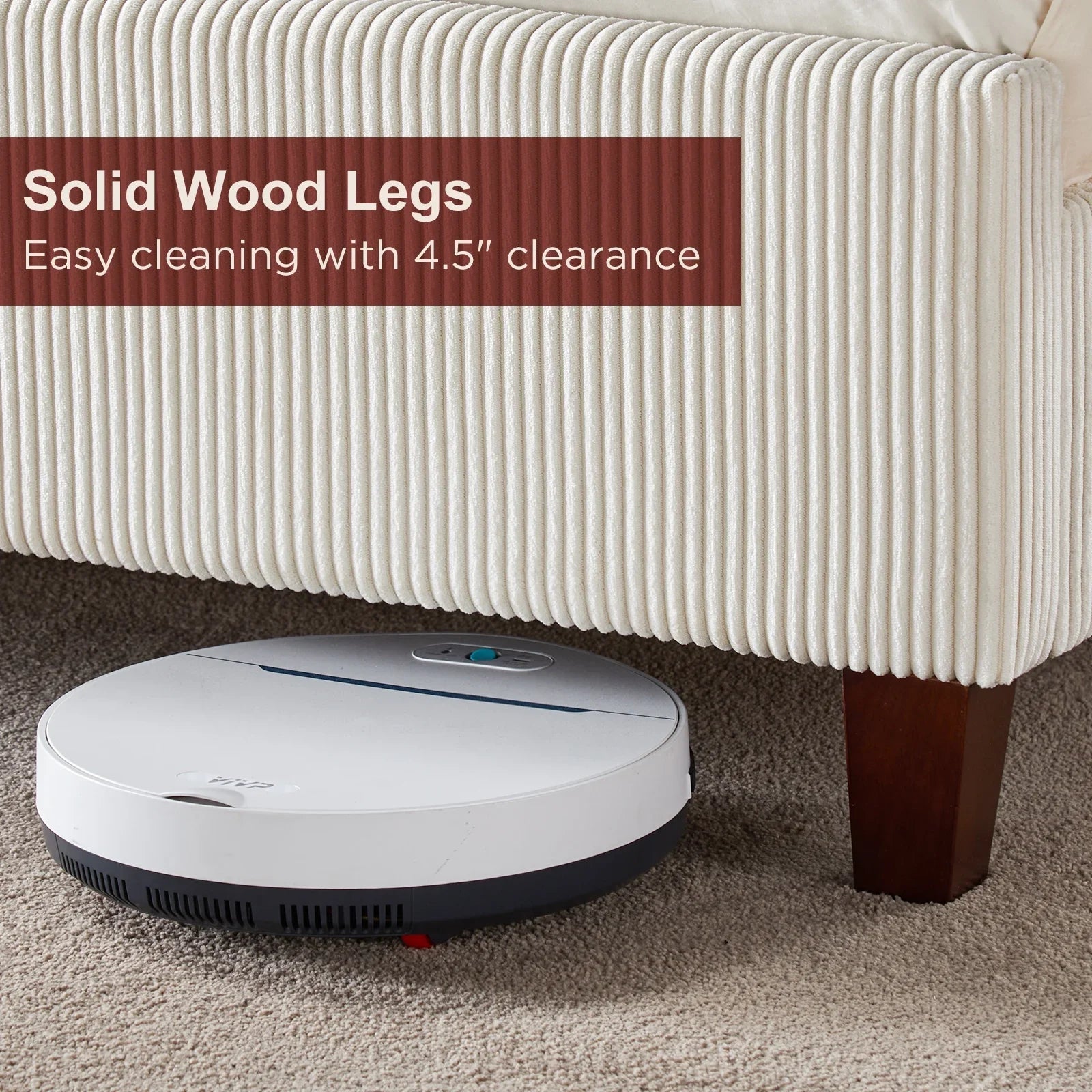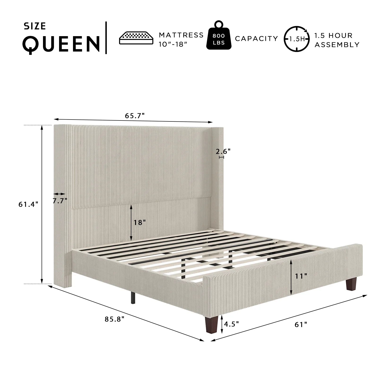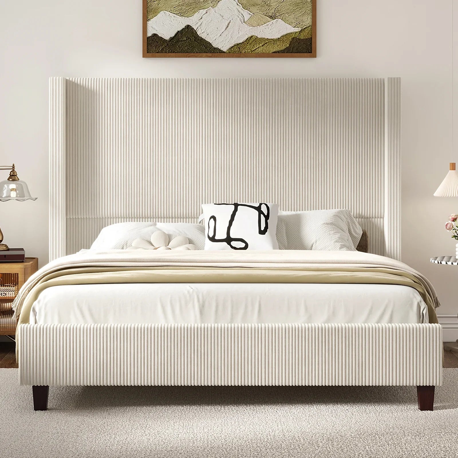 Queen Size 61" Corduroy Upholstered Bed Frame with Vertical Stripe Wingback Headboard/Cream
