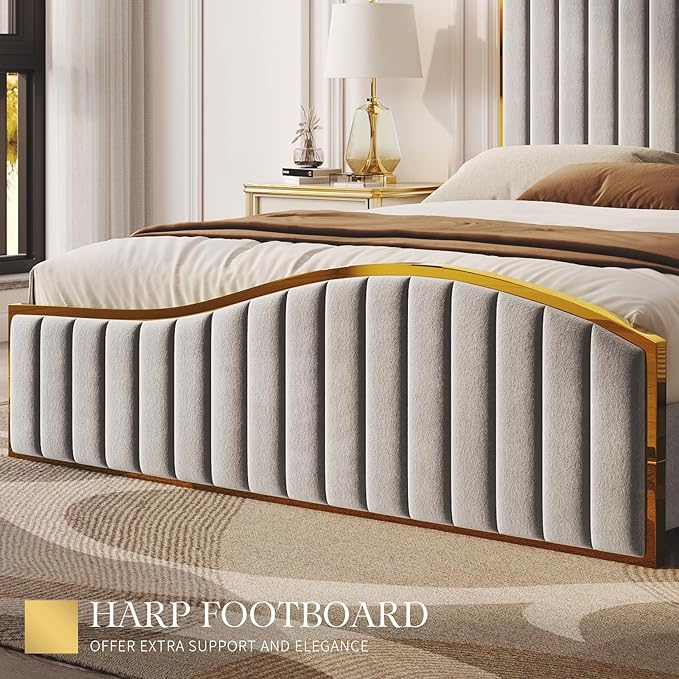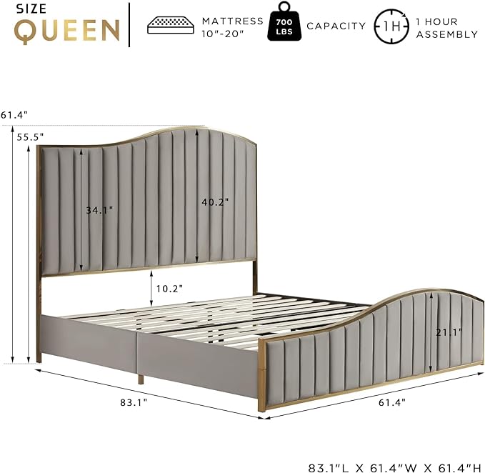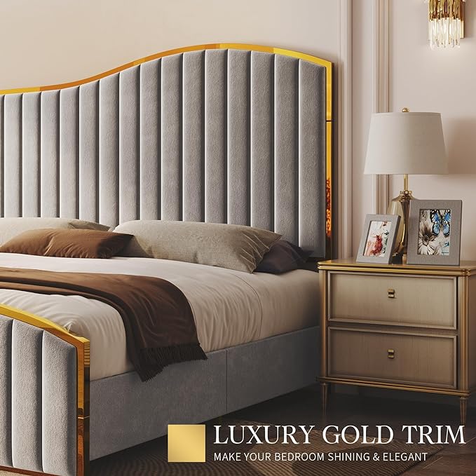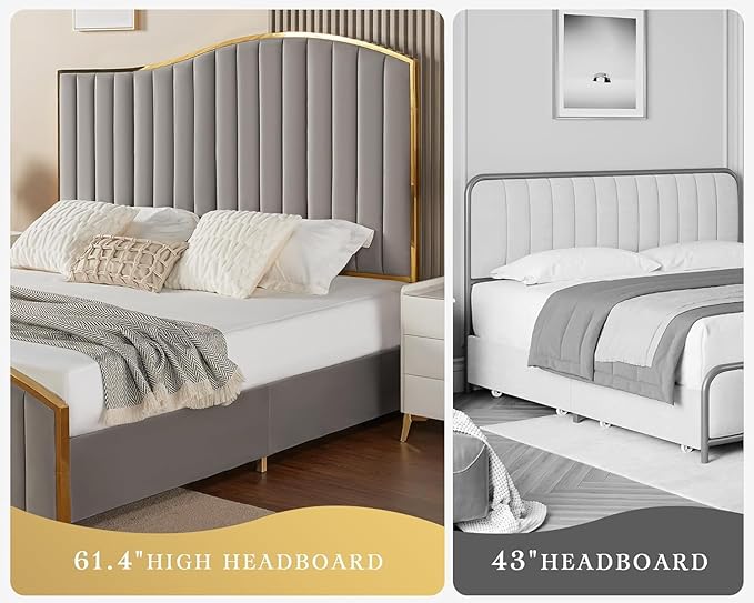 Queen Size Bed Frame, 61.4" High Headboard Platform Bed Velvet Upholstered with Gold Trim & Footboard/Wooden Slats/No Box Spring Required/Grey
