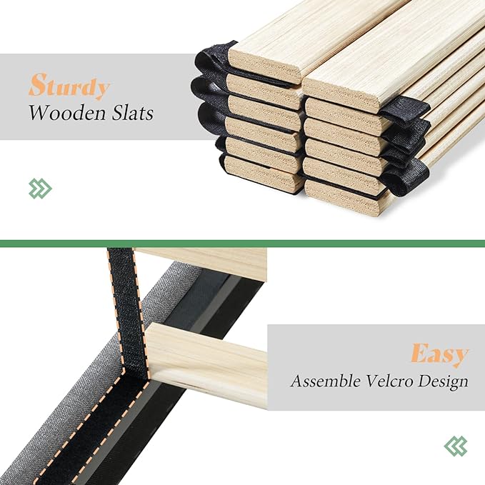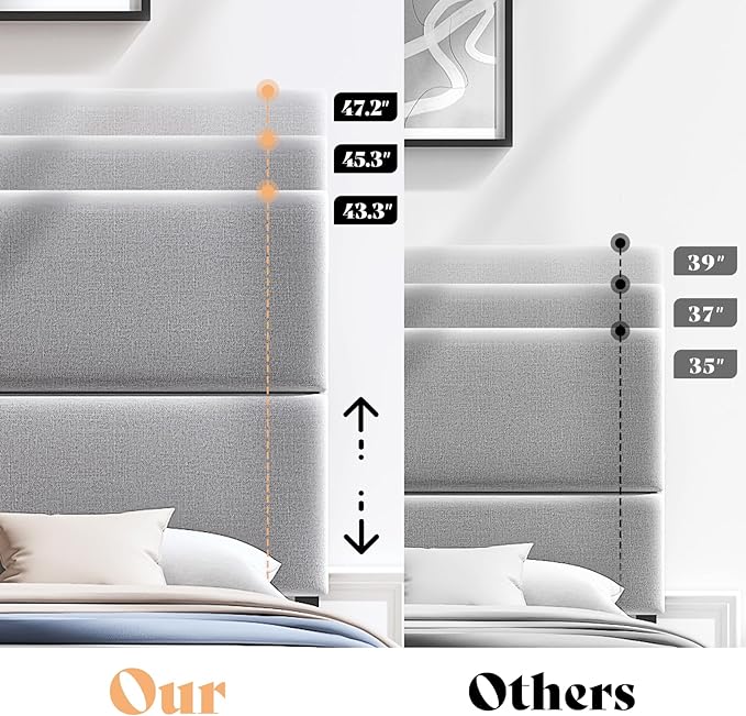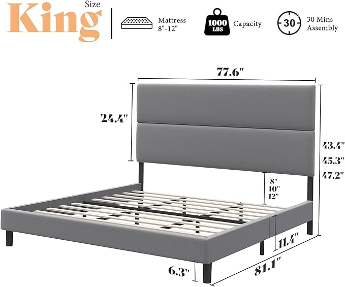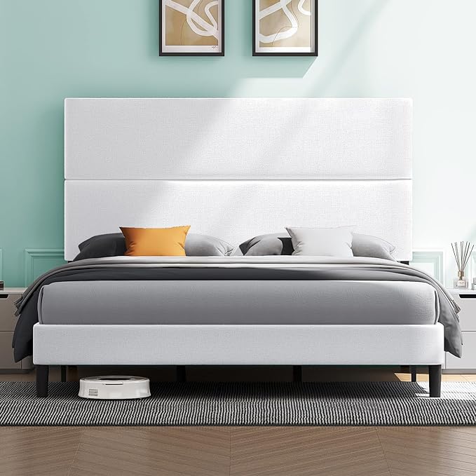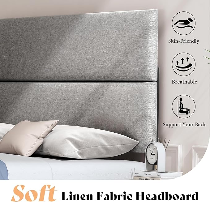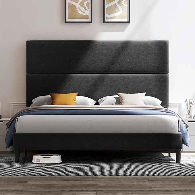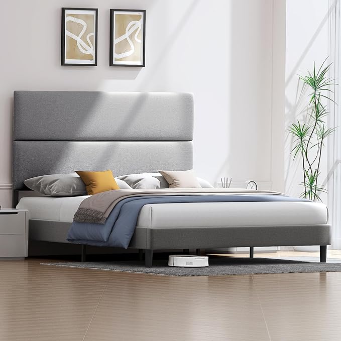 Queen Size Bed Frame with Adjustable Headboard, Linen Upholstered Platform Bed/Strong Wood Slats Support/Easy Assembly/No Box Spring Needed/Noise-Free/Light Grey
