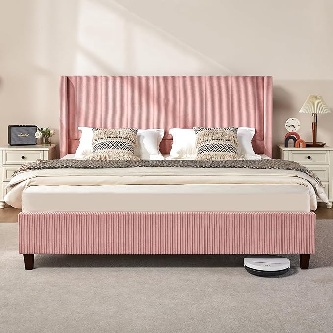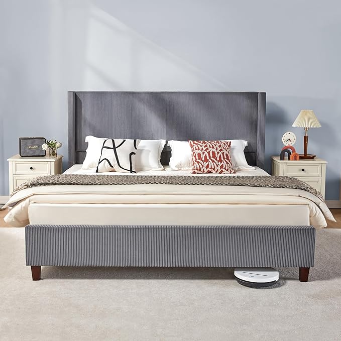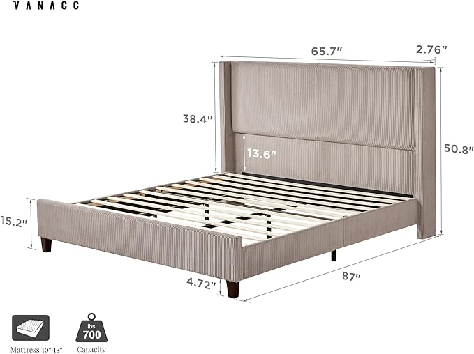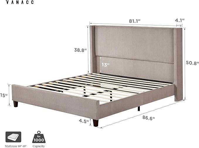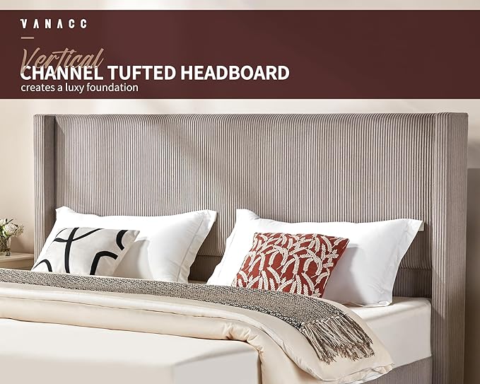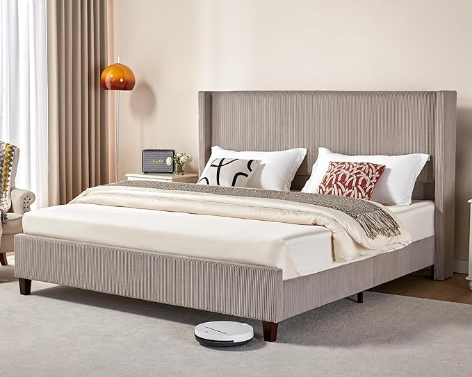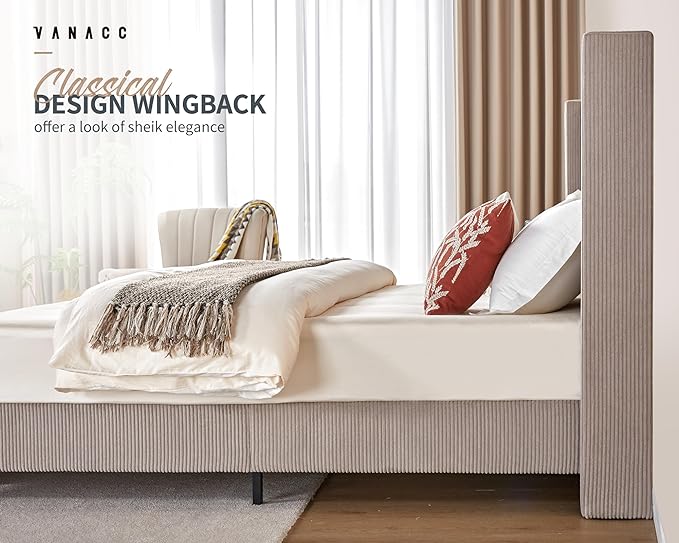 Queen Size Platform Bed Frame, 50.8" Corduroy Upholstered Bed with Vertical Channel Tufted Headboard/Wooden Slats/Wingback/No Box Spring Required/Taupe