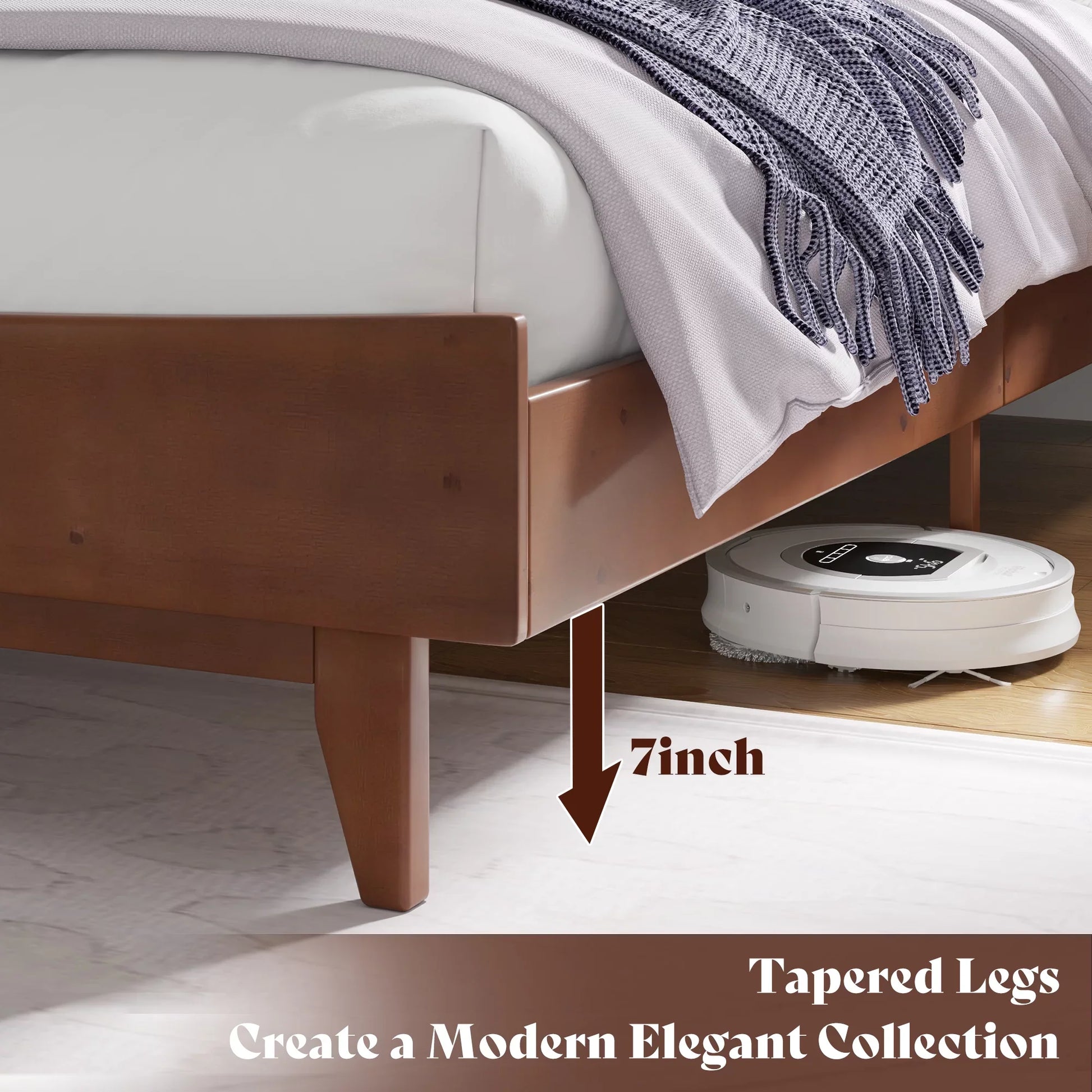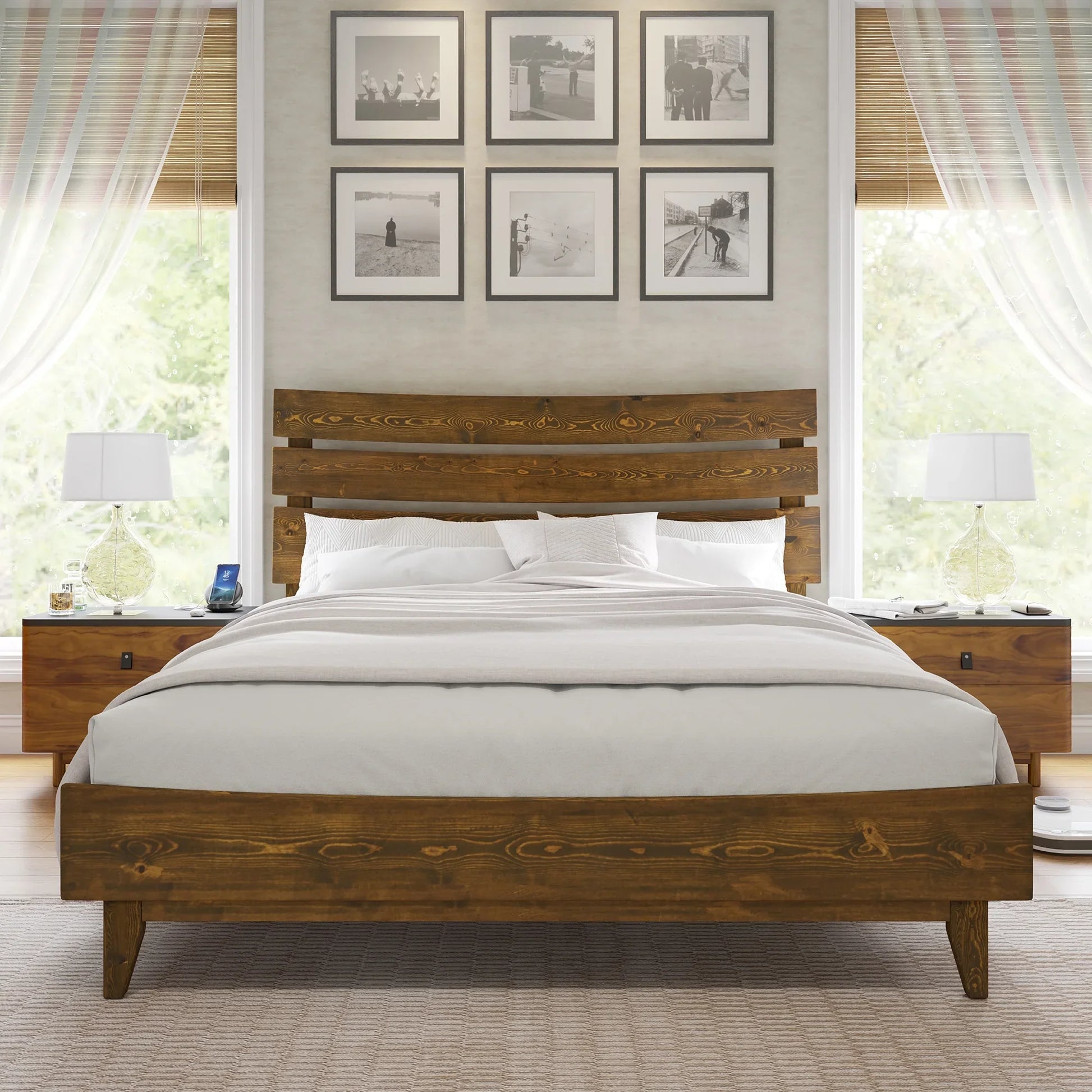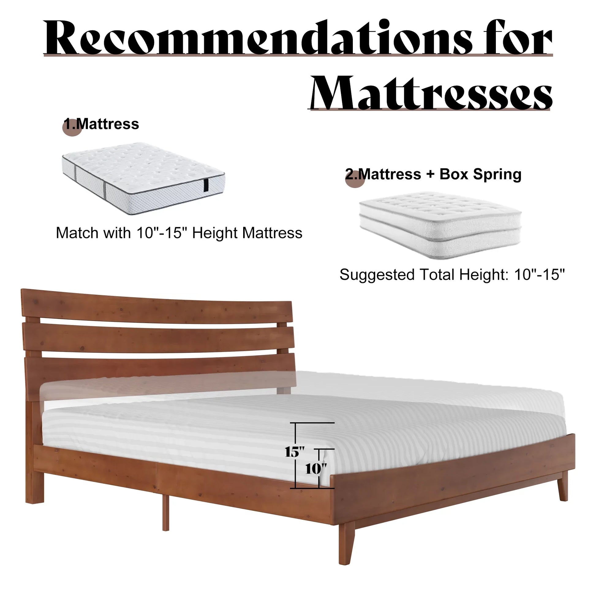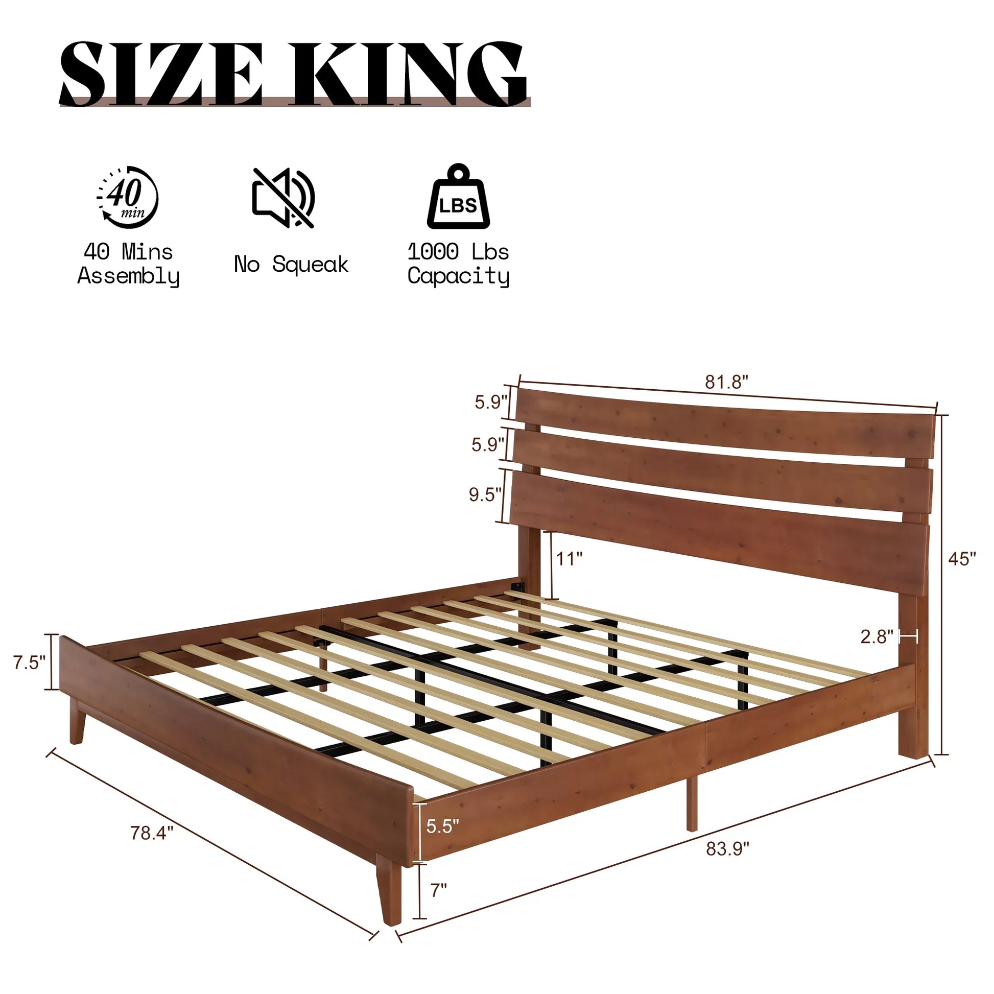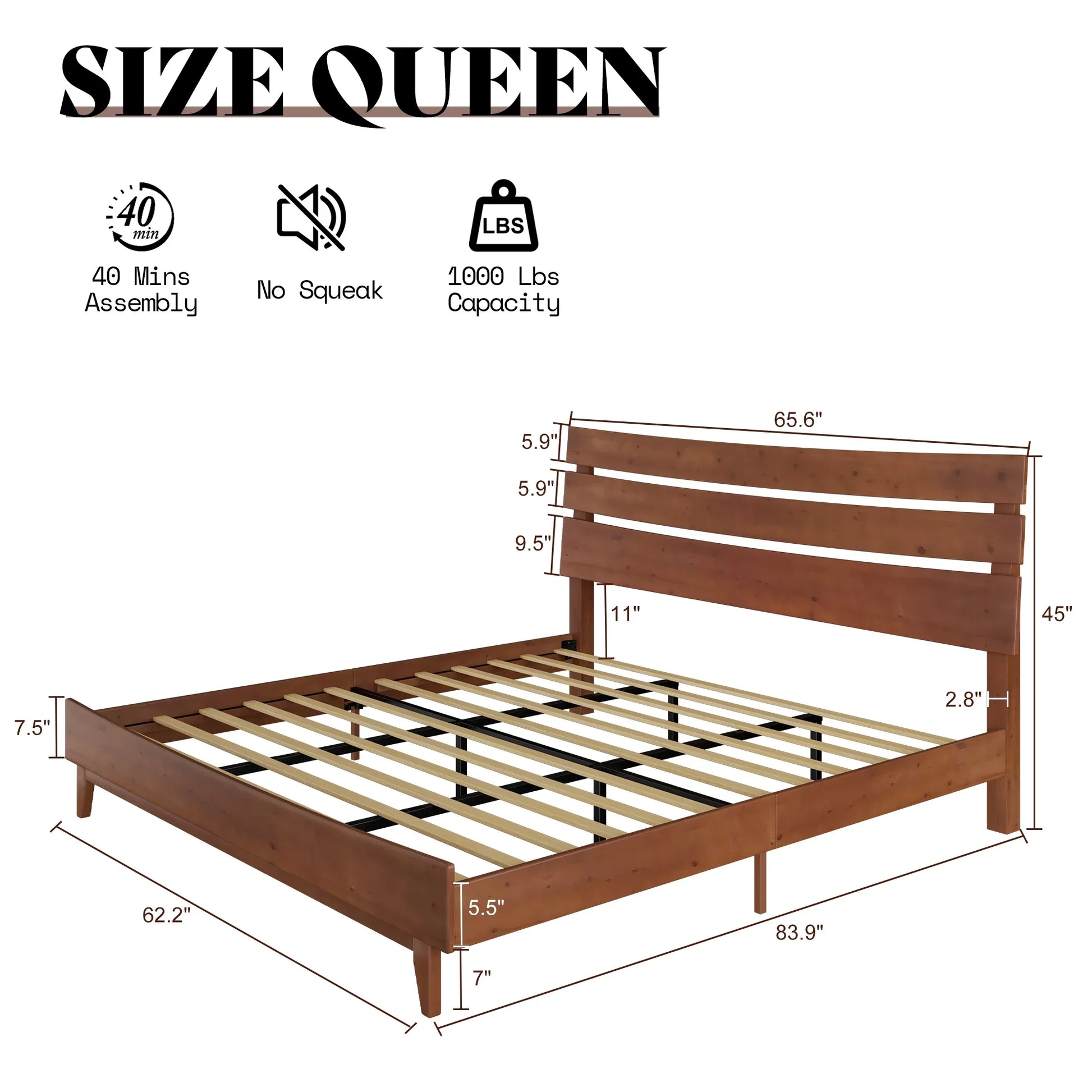 Queen Solid Wood Bed Frame with Slatted Headboard, Wood Slat Support, No Box Spring, Walnut
