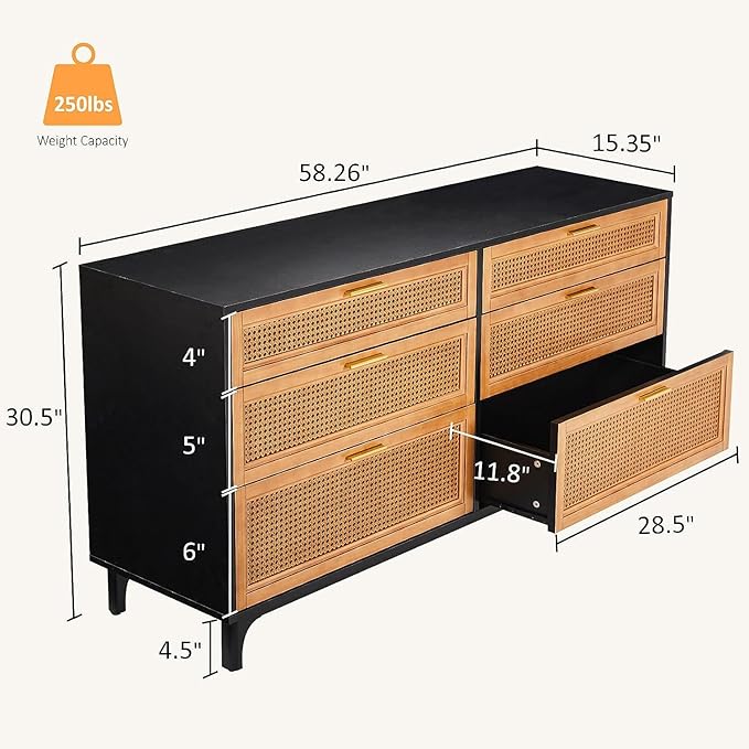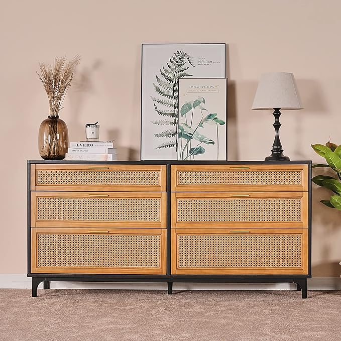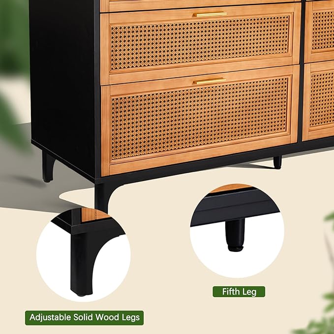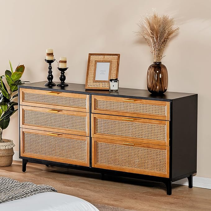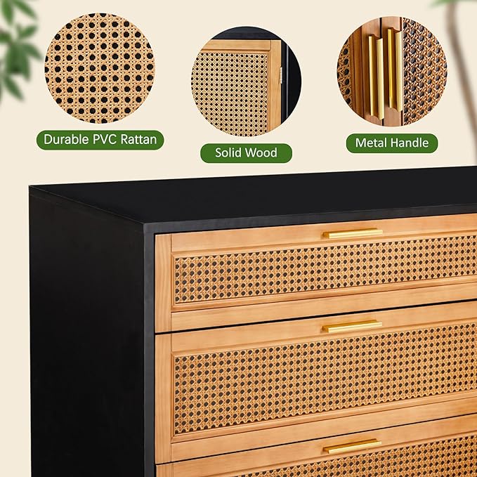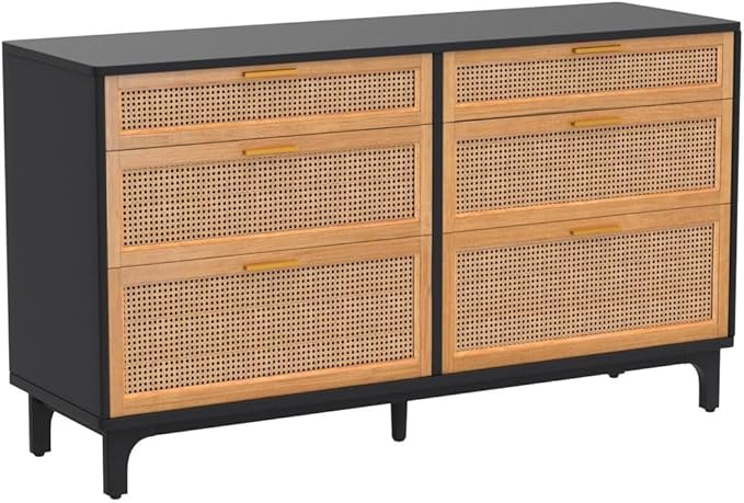Rattan Dresser with 6 Drawers, Chest of Drawers for Bedroom, Solid Wood Retro Tall Storage Drawers for Living Room, Entryway, Hallway, Black