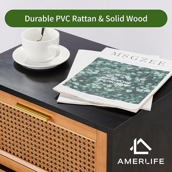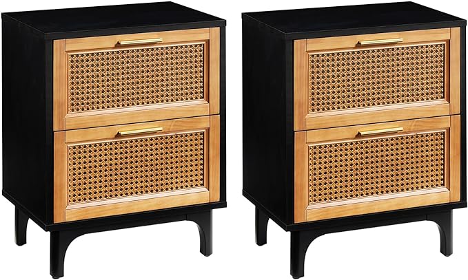 Rattan Nightstands Set of 2, Boho Accent Bedside Table with 2 Solid Wood Drawers Storage End Tables, Woven Vintage Side Tables for Bedroom, Black(2pcs)