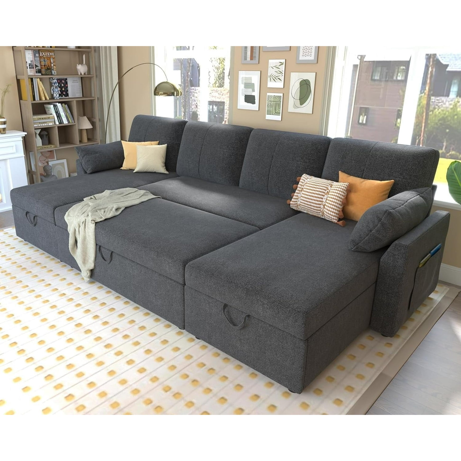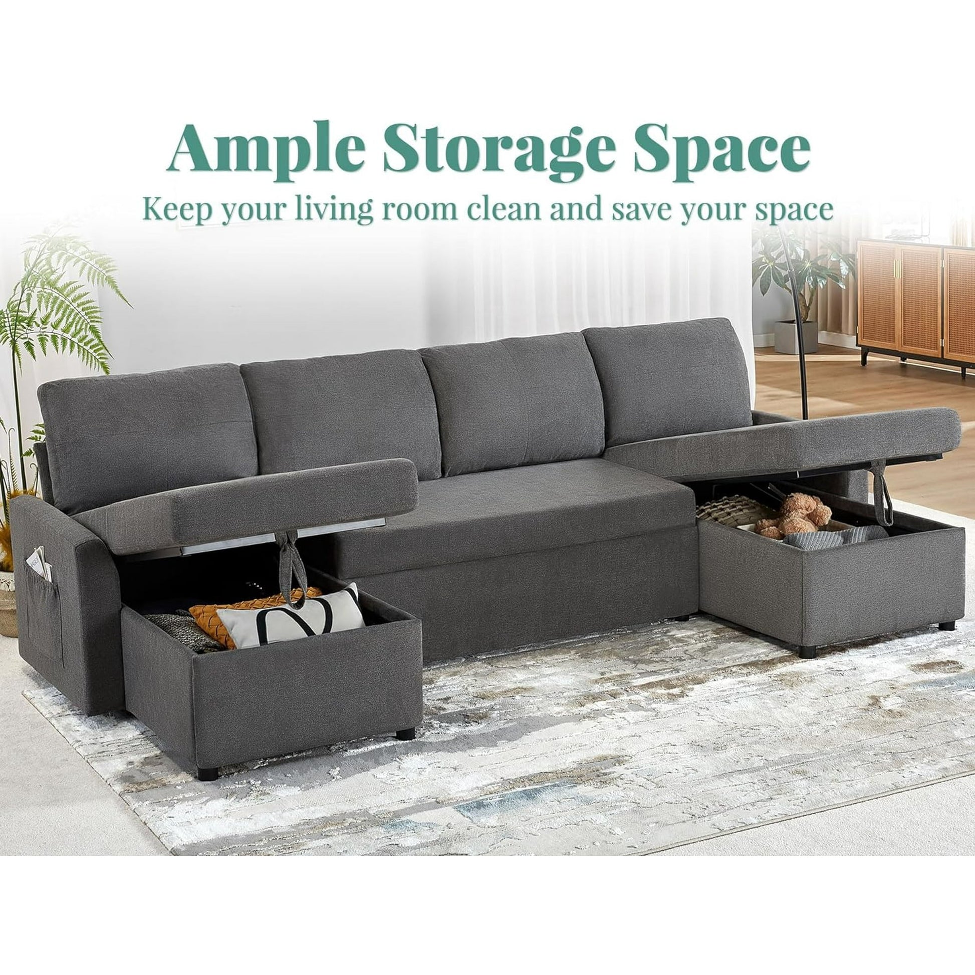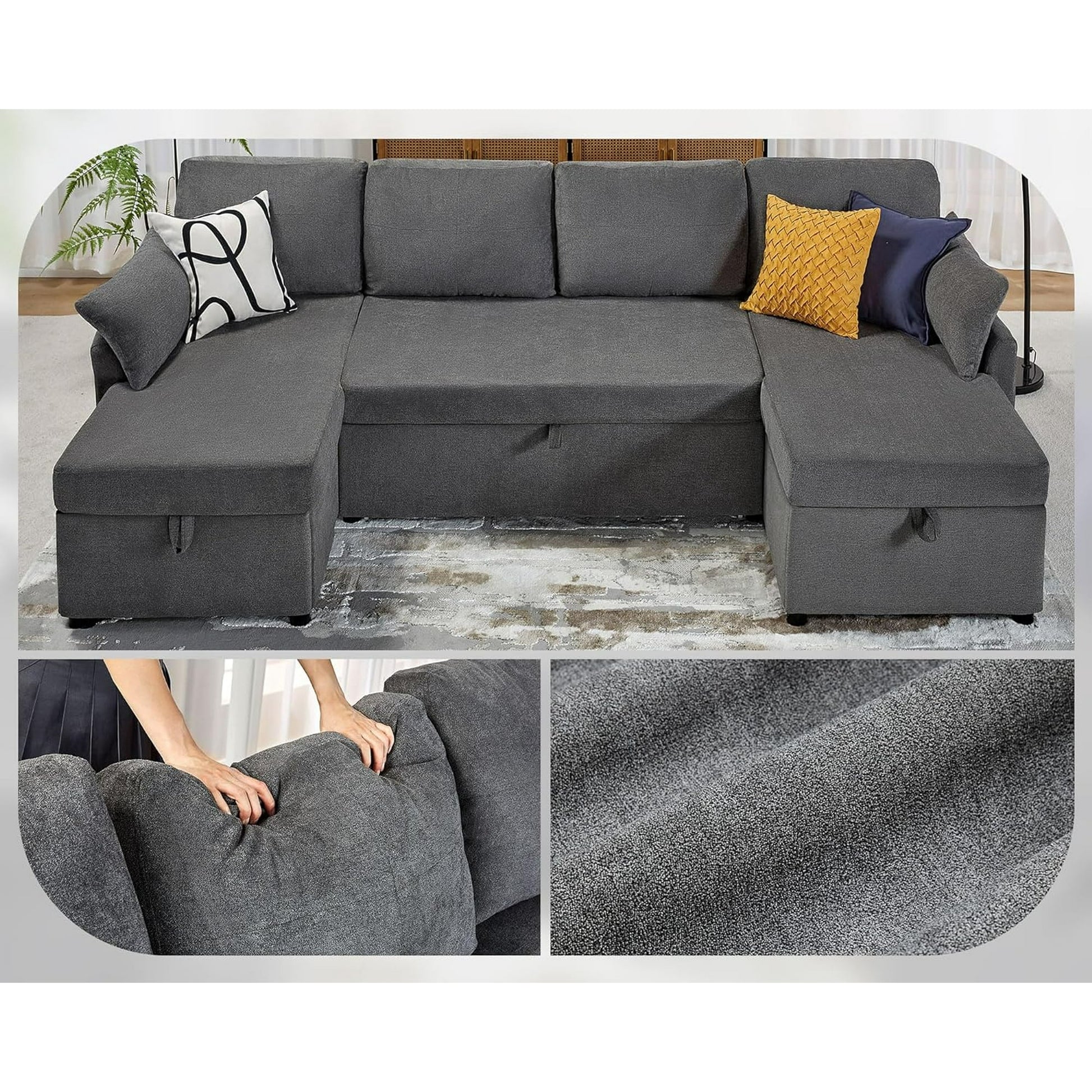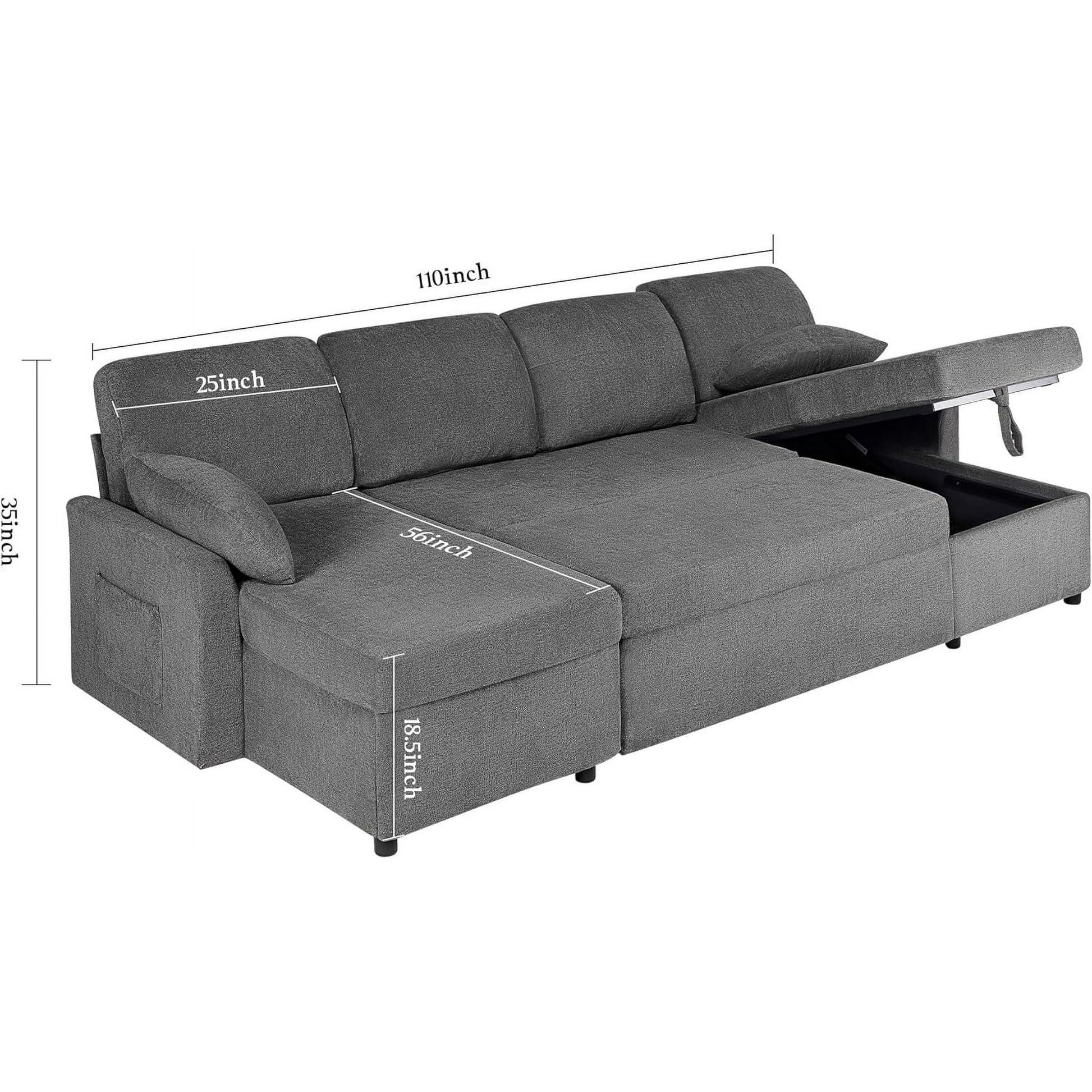 Sleeper Sofa, 110 inch Oversize Sofa Bed with 2 Storage Chaise for Living Room, Grey Chenille