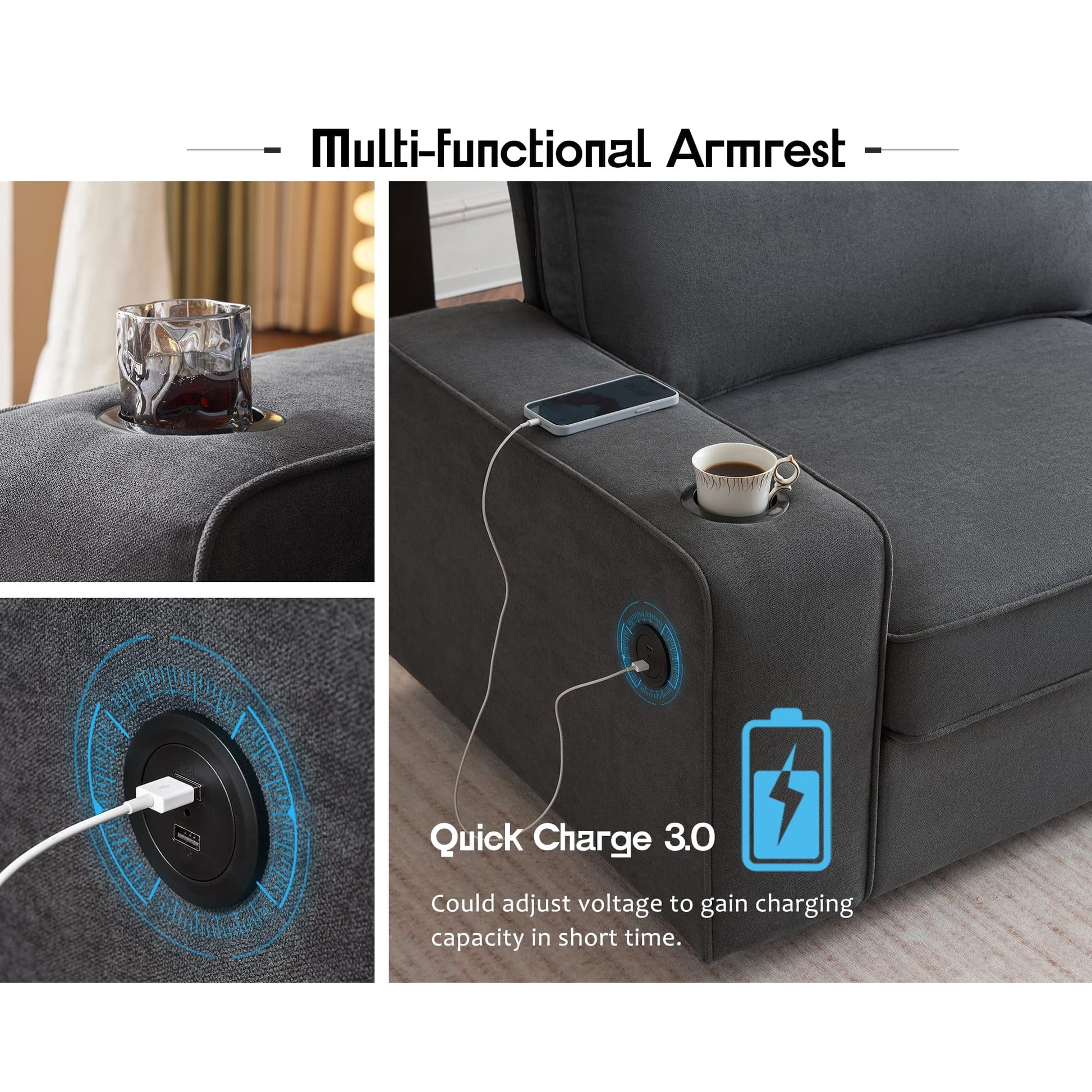 - Multifunctional USB Ports & Cup Holders: The sofa set is equipped with USB ports that utilize Quick Charge 3.0 technology, allowing for efficient device charging by adjusting to the optimal voltage. It features built-in cup holders to elevate your relaxation experience.