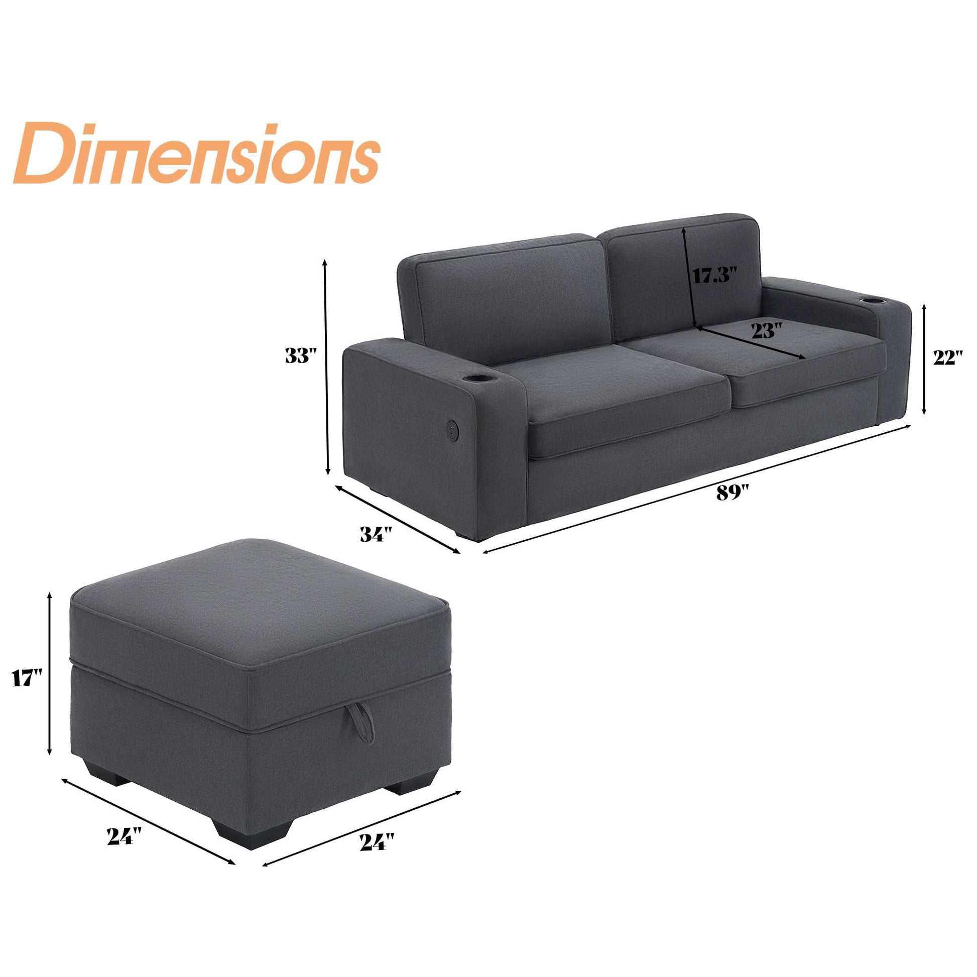 Sofa, 3 Seater Sofa- Deep Seat Sofa with Storage Ottoman, Comfy Couch with Cup Holders & USB Charging Ports, Modern Couch for Living Room(Charcoal Grey Chenille)