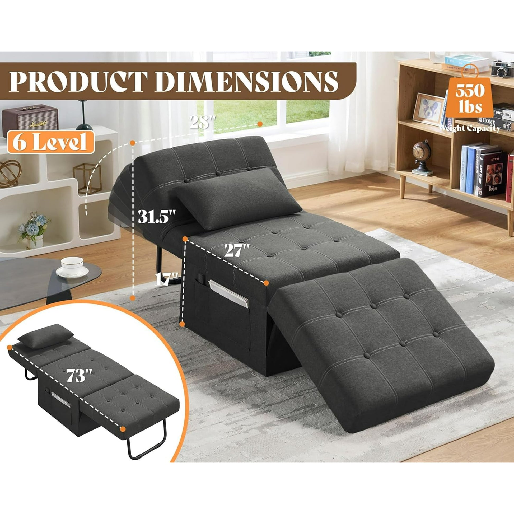 - 6-Levels Adjustable Backrest & Extra Pillow: Experience unparalleled flexibility with the adjustable backrest of this convertible sleeper chair. Accompanied with a soft pillow, it allows you to find the ideal sitting or reclining posture for optimal relaxation.