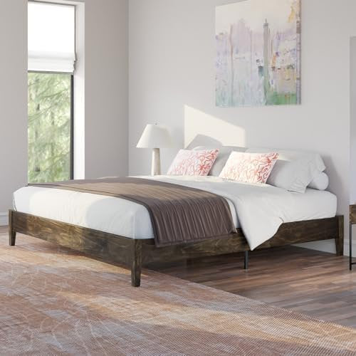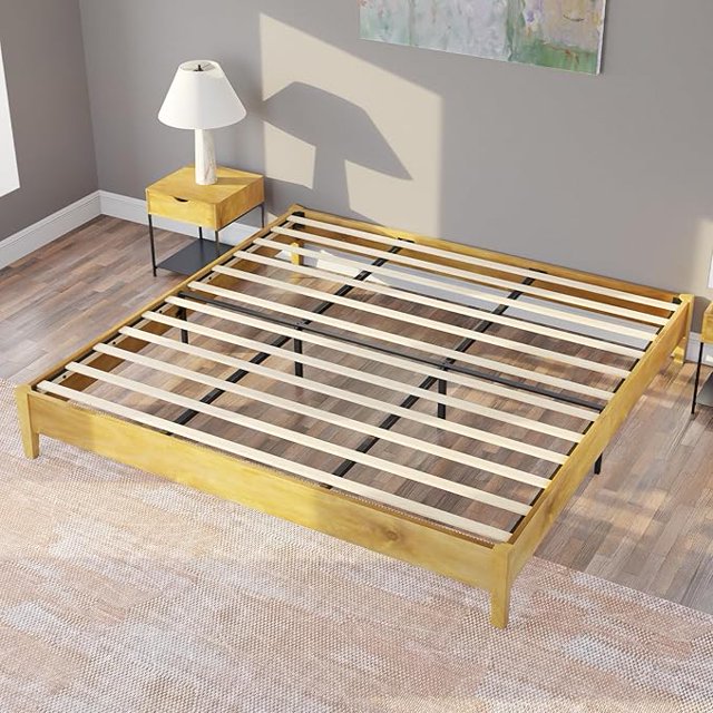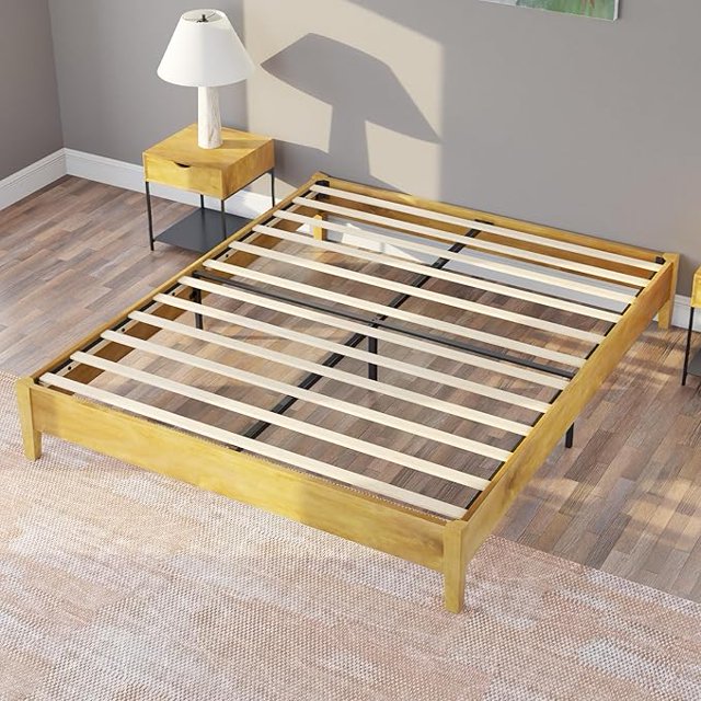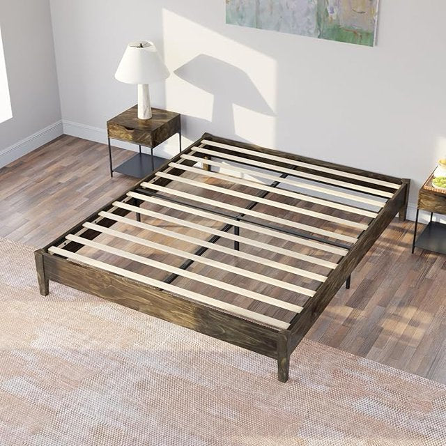 Solid Wood Bed Frame, Mid Century Platform Bed with No Headboard, Wood Slat Support/No Box Spring Needed/Noise Free