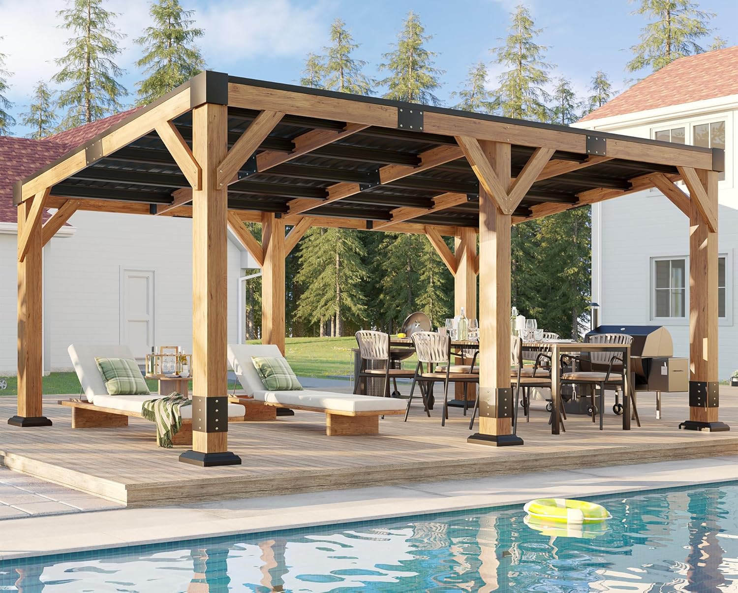 Solid Wood Gazebo with Metal Hardtop, Large Outdoor Pavilion with Sloped Roof