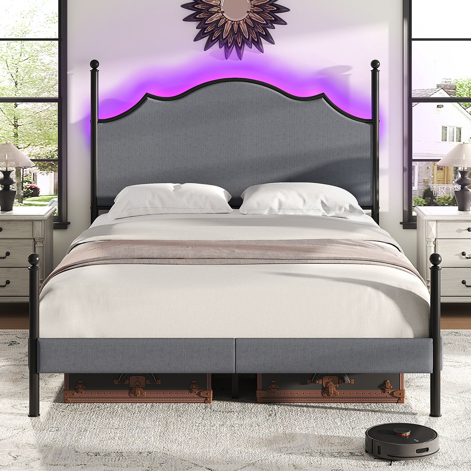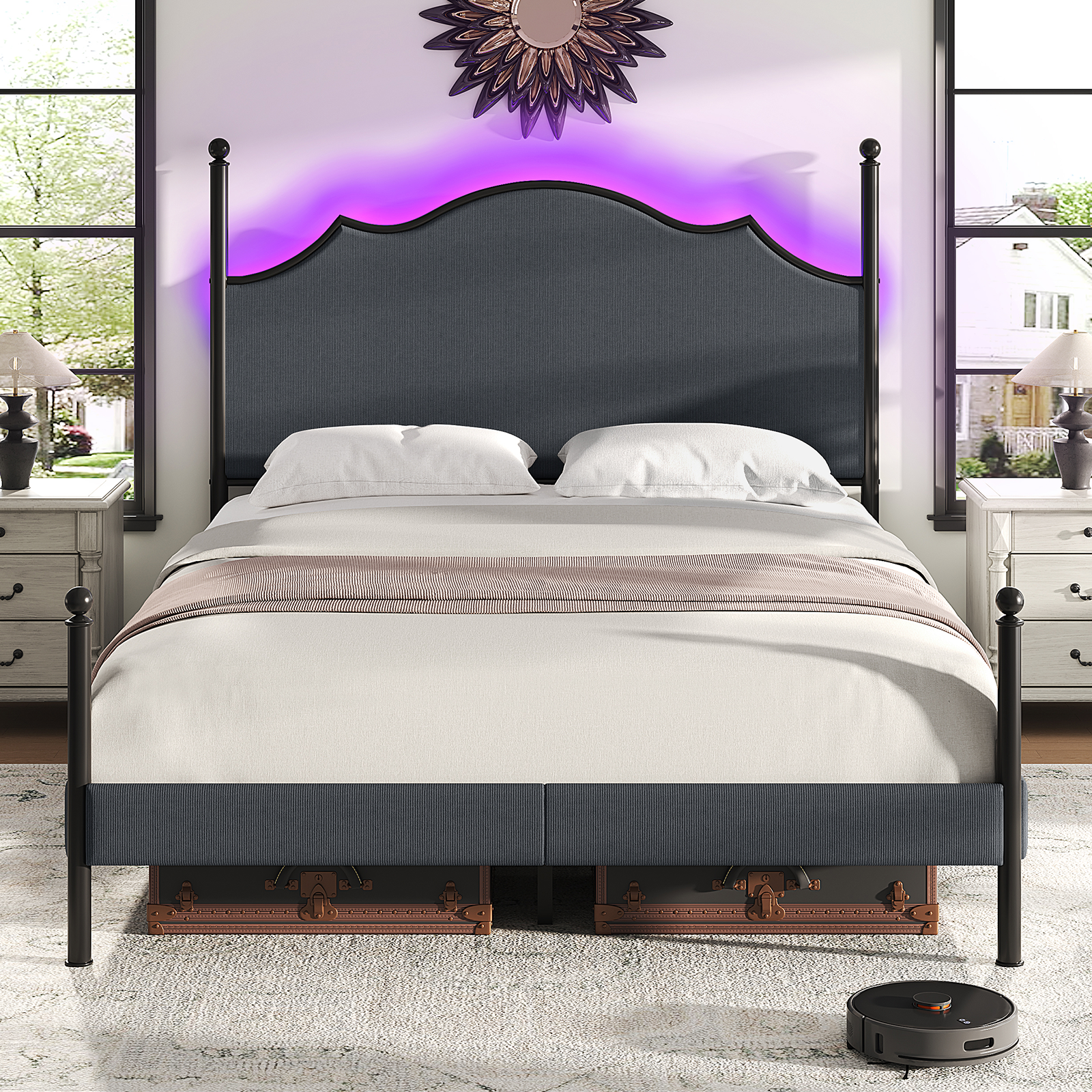 Upholstered Full Size Bed Frame with 51.2" Tall Headboard, Metal Four Poster LED Beds for Bedroom, Easy Assembly, Wooden Slats