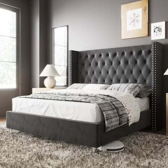 VANACC Bed Frame Upholstered Bed Wingback Headboard Velvet Tufted Diamond Button/No Box Spring Needed/Easy Assembly